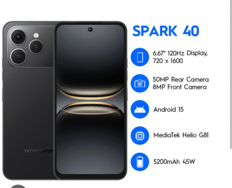 The Tecno Spark 40 is an excellent low-cost smartphone in terms of design, battery life, and display performance. It is ideal for students, social media users, and casual gamers thanks to its smooth 120Hz screen, dependable Helio G81 processor, and long-lasting 5200 mAh battery. The Tecno Spark 40 is a fantastic option in its class because it is fashionable, robust, and reasonably priced.